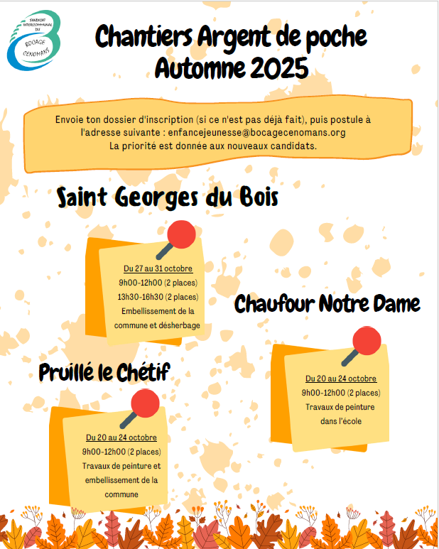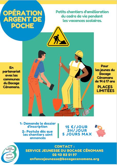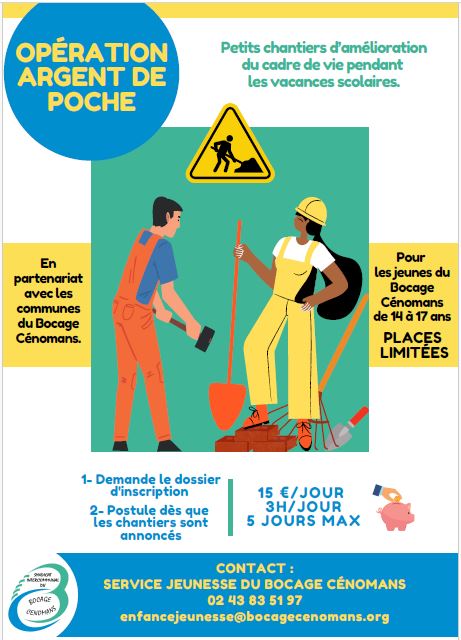 Tu habites sur les communes du Bocage Cénomans, tu as entre 14 et 17 ans et tu souhaites participer au dispositif Chantier Argent de poche :