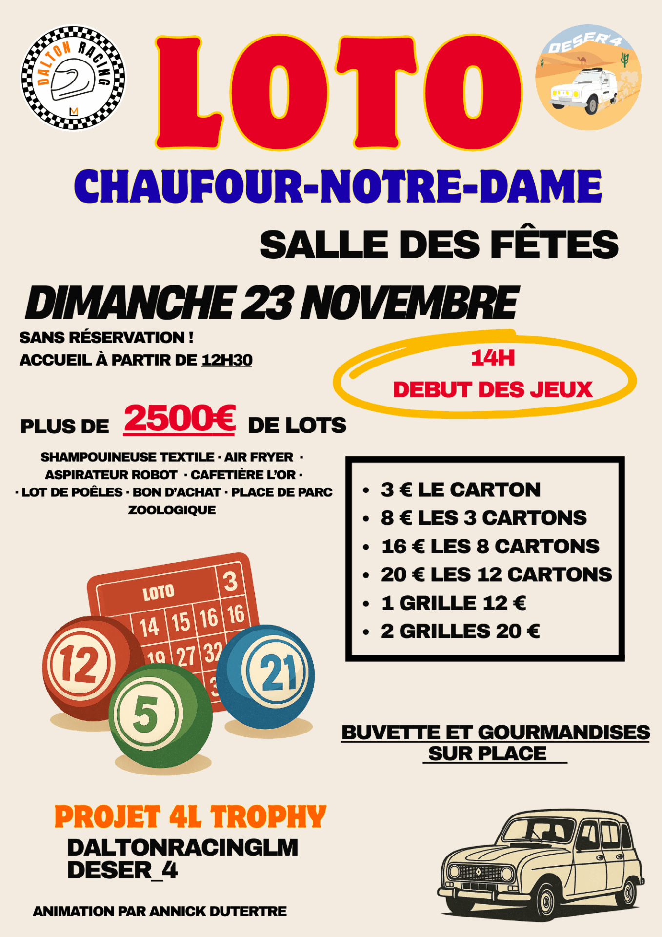 LOTO – PROJET 4L TROPHY DIMANCHE 23 NOVEMBRE – Début de jeu 14h Sans réservation – Accueil à partir…